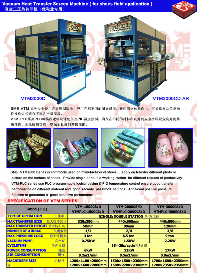 本工藝可解決在立體/曲面的產(chǎn)品表面上(如:筆記本計算機、i-phone、塑料產(chǎn)品外殼、行李箱,MP4,EVA花園鞋、人字拖鞋、涼鞋、不同材質(zhì)的休閑鞋)印刷圖案,通過此-立體真空熱轉(zhuǎn)印機械-將轉(zhuǎn)印膜上的精美平面圖像..清晰亮麗地展現(xiàn)出來。這新技術(shù)可幫助顧客節(jié)省費用和得到最優(yōu)秀與最耐久的圖像。